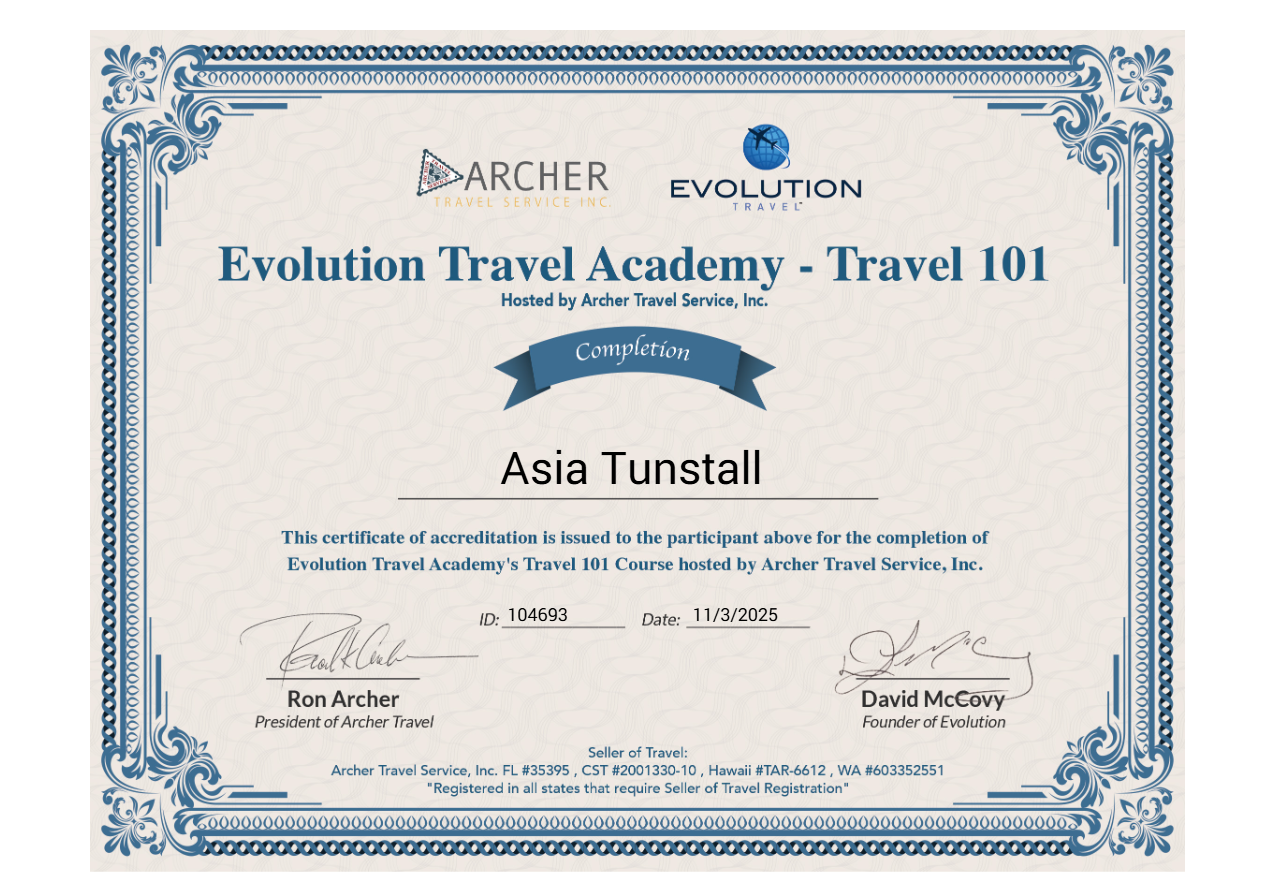 Hello! I’m Asia, founder of Vistasia Travel — where adventure meets luxury and every journey is designed with intention. With a graduate degree in Travel & Tourism and certifications from top industry leaders, I bring expert insight and trusted partnerships to every itinerary I create.